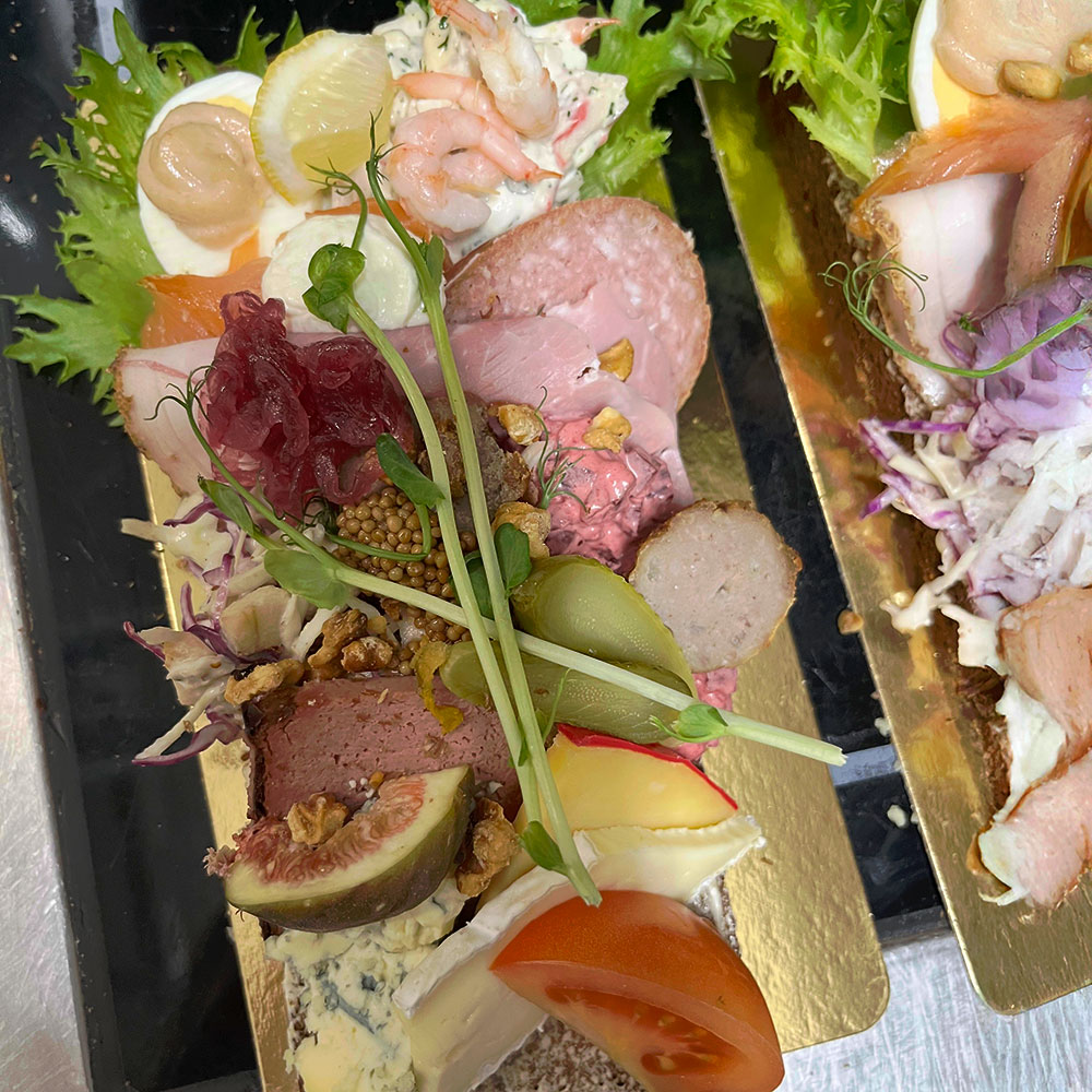 en matig landgång med godsaker från både hav och land görs som standard på landgångsbröd (går att beställa som GF) eller på dansk råglimpa
