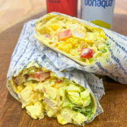 fylls med bageriets räkröra , tomat, gurka,ärtskott, sallad, räddisor