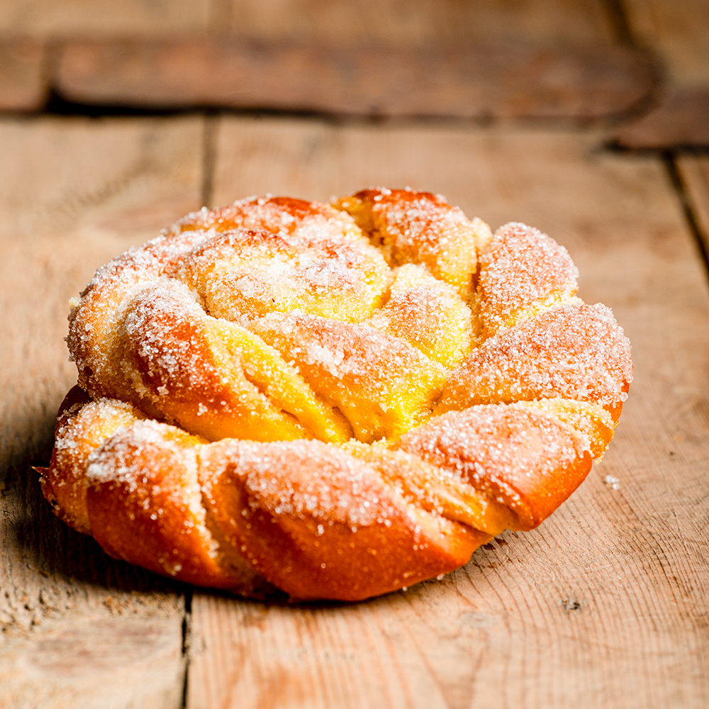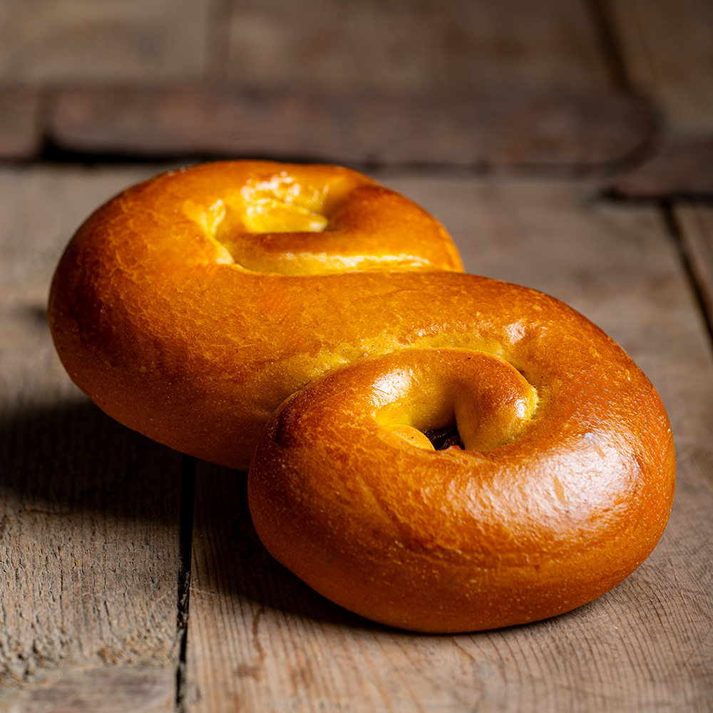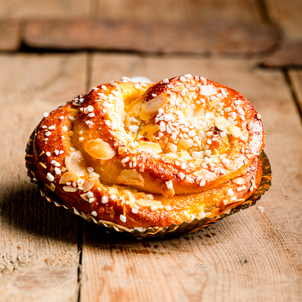 Klassisk saffransbulle bakad på smör, mjölk och innehåller russin och persisk saffran, fyllning smör och mandelremons
